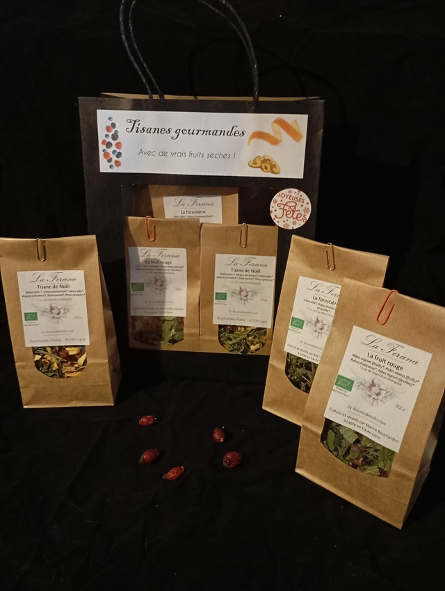 - tisane de Noël : pommes, écorces d'orange amères , jeunes pousses de sapin, verveine, cynorhodon, aiguille de pin sylvestre - 35gr